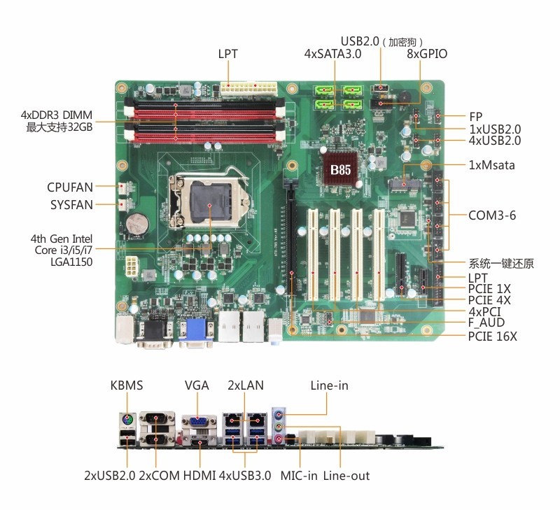 高性能配置:支持 LGA1150 接口的 4 代 Intel 酷睿 i7/i5/i3 处理器,搭配 4 条 DDR3 DIMM 插槽(最大 32GB 内存),轻松承载多任务并行处理与海量数据缓存;4 个 SATAIII+1 个 mSATA 存储接口,兼顾高速数据读写与灵活备份,满足工业数据长期留存需求。