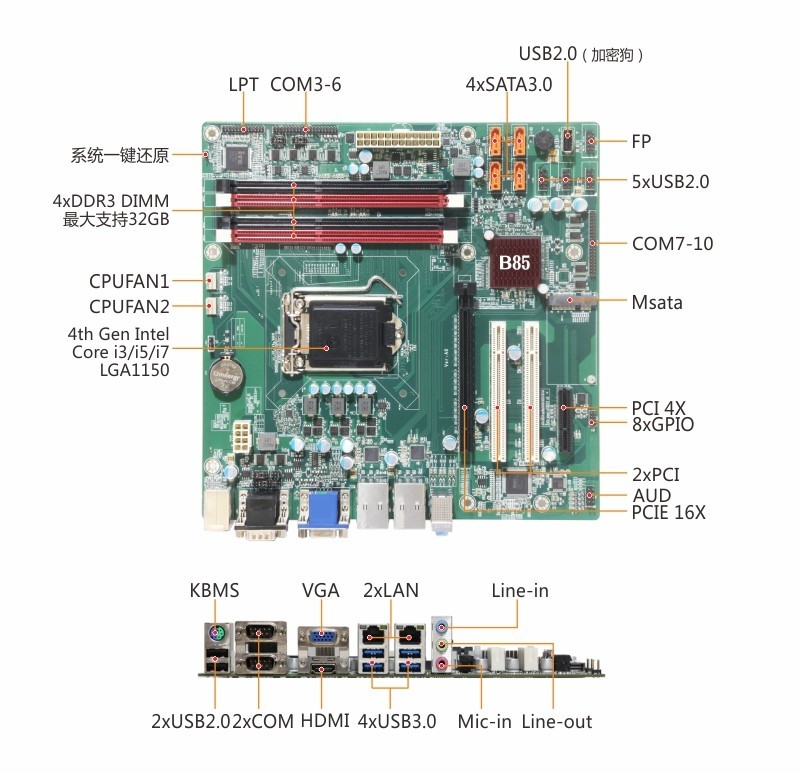 性能配置拉满:支持 LGA1150 接口的 4 代 Intel 酷睿 i7/i5/i3 处理器,搭配 4 条 DDR3 DIMM 插槽(最大 32GB 内存),可轻松承载多任务并行处理与海量数据缓存;4个 SATAIII+1个mSATA 存储接口,兼顾高速读写与灵活存储扩展,满足工业数据长期留存需求。