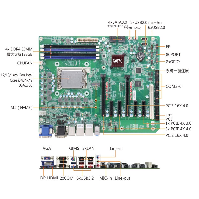 IPC-2010 2U 上架式机箱与 KTB-788G2 ATX 工业母板组成的硬核组合,依托 Intel Q670 芯片组的强大性能,打造出兼具高算力、强扩展与高稳定性的工业级计算平台。主板支持 12/13/14th Gen LGA1700 Intel Core i9/i7/i5/i3 及 Pentium/Celeron 全系列处理器,4 条 DDR4 DIMM 内存插槽最大可扩展至 128GB,搭配 4 个 SATAIII 接口与 1 个 M.2 插槽(支持 SATA 总线和 Nvme 协议),并支持软件 RAID 0/1/5/10,既能承载复杂工业控制程序与视觉分析算法,又能通过磁盘阵列技术保障关键数据安全,完美适配高负载工业场景需求。
